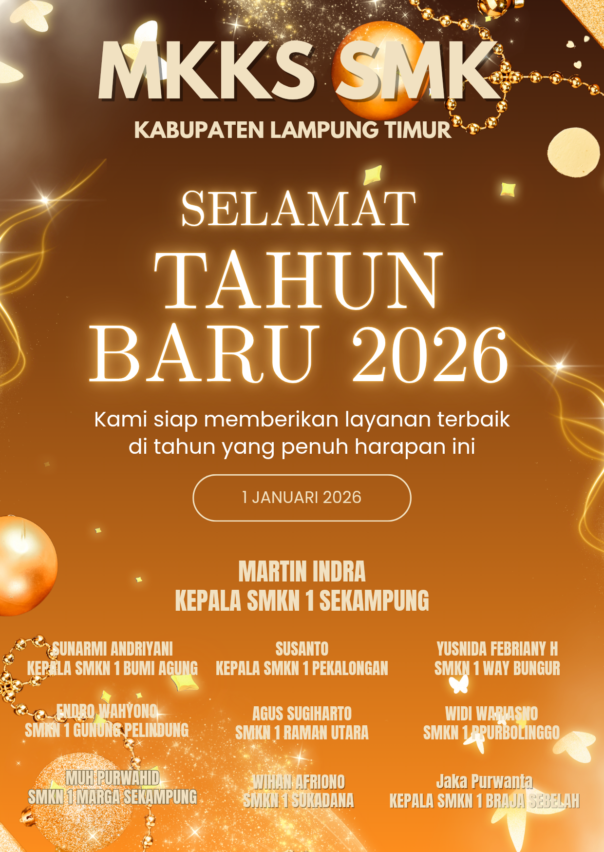 Lampung Timur, Jpl.news — Menjelang perayaan Natal 2025 dan Tahun Baru 2026, Forum Musyawarah Kerja Kepala Sekolah (MKKS) SMK Kabupaten Lampung Timur menyampaikan ucapan penuh kehangatan dan harapan baru bagi seluruh masyarakat pendidikan di wilayah tersebut.