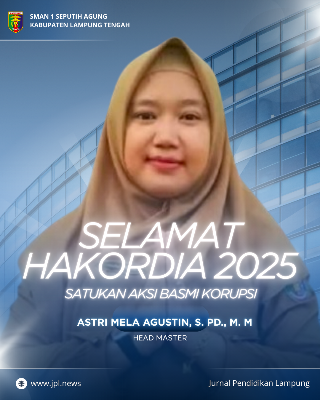 Lampung Tengah, Jpl.news – Dalam rangka memperingati Hari Anti Korupsi Sedunia (Hakordia) 2025, Kepala SMAN 1 Seputih Agung, Kabupaten Lampung Tengah, Astri Mela Agustin, S.Pd., M.M., menyampaikan ucapan selamat serta mengajak seluruh masyarakat untuk terus menumbuhkan integritas, kejujuran, dan semangat anti korupsi dalam setiap aspek kehidupan.