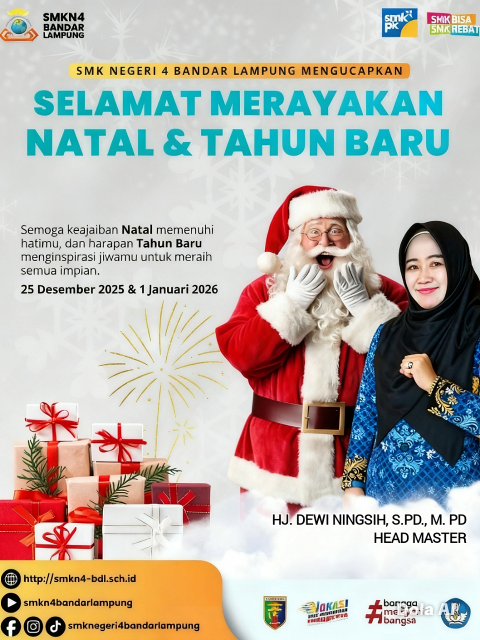 Ucapan dan pesan inspiratif ini menjadi penutup yang hangat bagi perjalanan SMKN 4 Bandar Lampung di tahun 2025, sekaligus pembuka semangat baru untuk melangkah menuju tahun 2026 dengan optimisme dan harapan yang lebih baik. (Tim)