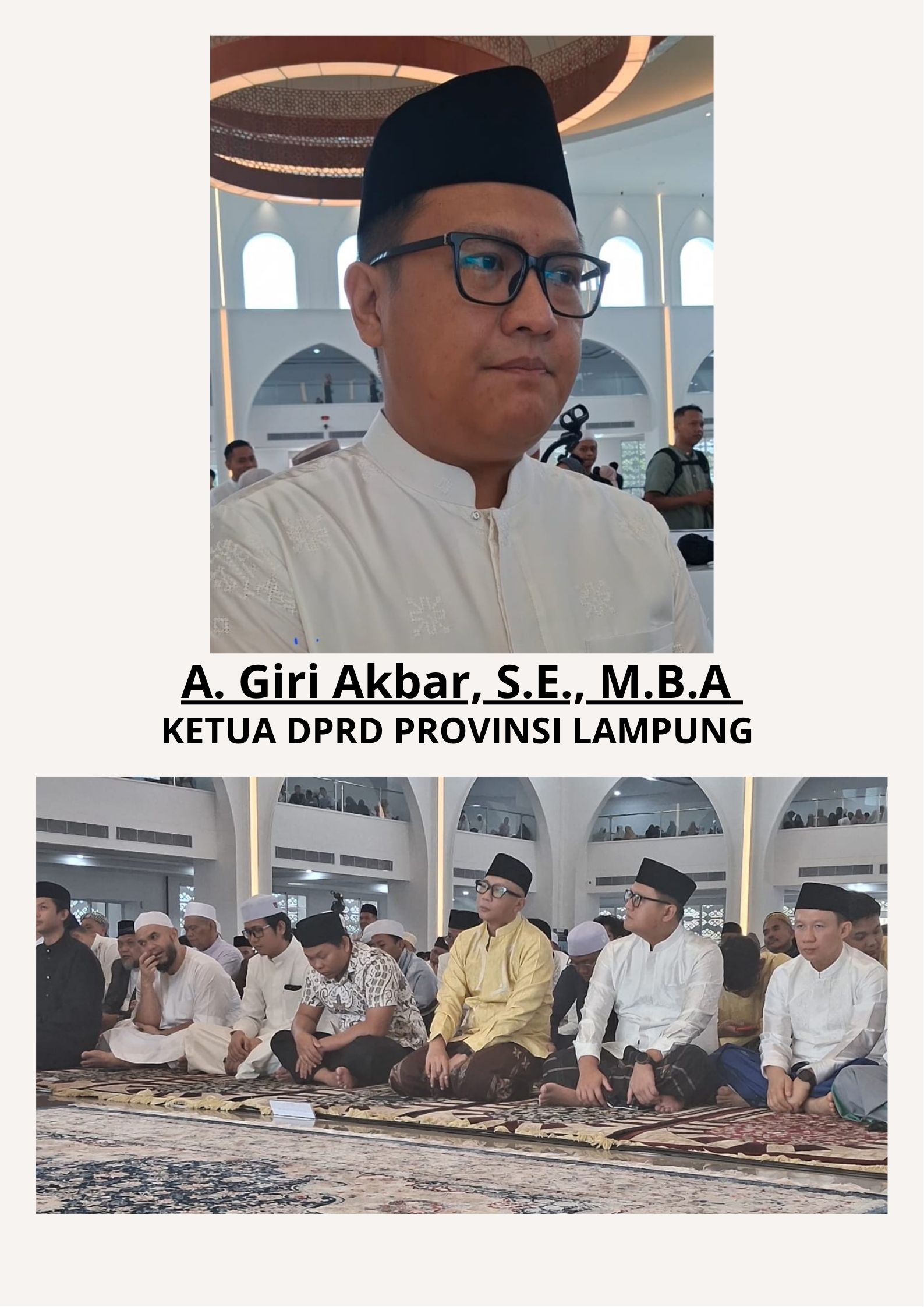 Bandar Lampung — Ketua DPRD Provinsi Lampung Ahmad Giri Akbar, SE., MBA., menghadiri pelaksanaan Shalat Idulfitri 1447 Hijriah bersama Gubernur Lampung Rahmat Mirzani Djausal. ST. MT dan ribuan masyarakat di Masjid Raya Al-Bakrie, Sabtu (21/3/2026).